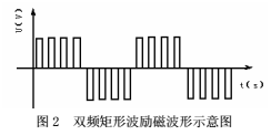 常規(guī)電磁流量計(jì)所應(yīng)用的低頻方波勵磁方式的勵磁電流頻率通常為工頻的1/4~1/10。目前深井(6000m以上)的固井施工中所使用泥漿的密度大多在1.8g/cm³以上,流速高達(dá)25m/s,所用的泥漿又是固液兩相低導(dǎo)率流體,雖然高壓下能消除非牛頓流體所帶來的測量誤差,但測量管內(nèi)會產(chǎn)生隨流量增加而頻率增加的隨機(jī)干擾噪聲。經(jīng)測定,在DN50測量管內(nèi),所用的泥漿密度為2.0g/cm³,流速在10~15m/s范圍內(nèi),測量管內(nèi)的流動噪聲主要為尖峰狀的泥漿流噪聲,量級在mv級,頻率集中在25Hz以下,如圖1所示。在勵磁頻率較低時(shí),泥漿干擾的數(shù)量級較大,高頻時(shí)干擾數(shù)量級較小,具有1/f的頻譜特性。另外,施工現(xiàn)場敲擊和震動所帶來的低頻噪聲,也會影響電磁流量計(jì)的計(jì)量精度。提高勵磁電流頻率可以規(guī)避和抑止這些干擾,以提高電磁流量傳感器輸出的信噪比,但會犧牲電磁流量計(jì)的零點(diǎn)穩(wěn)定性。本文提出新的一種勵磁方式,采用雙頻矩形波作為勵磁信號。其勵磁電流波形是在低頻矩形波上疊加高頻矩形波,用兩種采樣頻率分別得到高頻和低頻兩種流量信號。如圖2所示,高頻部分是80Hz的矩形波,外包絡(luò)線是10Hz的低頻矩形波。這樣,能克服單一低頻矩形波勵磁存在的泥漿流動噪聲,同時(shí)又能保證零點(diǎn)的穩(wěn)定性,提高流量計(jì)的計(jì)量穩(wěn)定性和響應(yīng)速度。