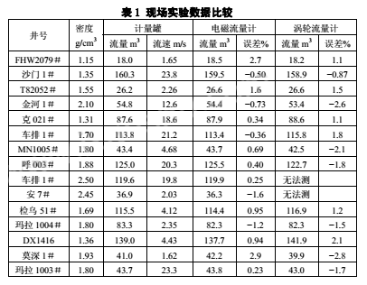 現(xiàn)場試驗(yàn)所用測量管的內(nèi)徑為DN50,通過高壓由壬接入泥漿管線,并串接渦輪流量計(jì)進(jìn)行比較,采用標(biāo)準(zhǔn)計(jì)量罐測試。計(jì)量鉆井泥漿密度范圍為1.15g/cm³~2.50g/cm³,固井設(shè)計(jì)施工現(xiàn)場一次性替漿量為18m³~160m³,替漿瞬時(shí)流量為0.2m³/min~2.8m³/min(流速:1.6~23.8m/s);通過近15口井的施工應(yīng)用,結(jié)果如表1所示。試驗(yàn)表明儀表計(jì)量誤差小于1%;在流速2.0m/s以下,隨著流量的減少測試誤差逐漸提高,在流速1.0m/s左右計(jì)量精度降到3%左右。經(jīng)分析,主要是由零點(diǎn)漂移引起的,這點(diǎn)與實(shí)驗(yàn)室用清水標(biāo)定結(jié)果基本吻合。使用DN50的測量管,實(shí)驗(yàn)室標(biāo)定結(jié)果如表2所示。試驗(yàn)證明,采用雙頻矩形波作為勵磁信號,可有效地規(guī)避和抑止固井泥漿的流動噪聲和現(xiàn)場震動等所帶來的低頻噪聲,從而顯著提高儀表計(jì)量泥漿的精度。