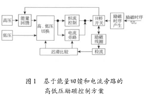 基于能量回饋和電流旁路的高低壓勵磁控制方案框圖如圖1所示,主要由高、低壓電源、能量回饋電路、高、低壓切換電路、恒流控制電路、電流旁路電路、H橋開關(guān)電路、檢流電路和勵磁時序產(chǎn)生電路組成。
