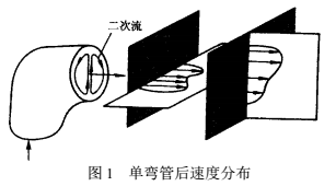 流體流過彎管由于離心力作用,靠外壁產(chǎn)生擴(kuò)散效應(yīng),內(nèi)壁產(chǎn)生收縮效應(yīng),由此產(chǎn)生橫向流動的二次流,引起下游產(chǎn)生速度分布畸變,如圖1所示。圖1中,右邊垂直剖面彎管外緣流速較快,水平剖面呈雙峰值流速分布。隨著液流離開彎管距離增加.畸變會趨于緩和。
