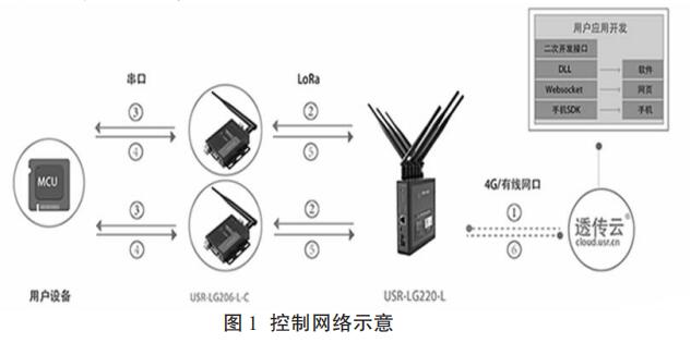 基于 LoRa 技術(shù)的無(wú)線流量計(jì)由控制,計(jì)量,通信,電源,存儲(chǔ)五個(gè)模塊組成。以污泥回流流量計(jì)為主體的計(jì)量模塊將采集到的供暖管道數(shù)據(jù)發(fā)送到通信模塊,基于 LoRa 技術(shù)的通信模塊將流量數(shù)據(jù)存儲(chǔ)并且發(fā)送到由管理人員監(jiān)控的控制模塊,管理人員通過(guò)控制模塊和通信模塊向流量計(jì)發(fā)送指示。電源模塊是無(wú)線流量計(jì)的能源中心,可以為流量計(jì)的其他模塊提供動(dòng)力支持。流量計(jì)安裝完畢后可在小區(qū)內(nèi)形成控制網(wǎng)絡(luò),網(wǎng)絡(luò)示意圖如圖 1 所示。