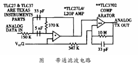 HART數(shù)字信號規(guī)范是峰值為1mA、平均值為0mA正弦交流電流信號,此信號經(jīng)線路阻抗轉(zhuǎn)化為正弦交流電壓信號,而HT2012輸入和輸出信號是0~5V的方波信號,因此在HT2012和外部的HART信號之間還需要有濾波電路和整形電路。如圖3所示,由TLC27組成的濾波器是帶通濾波器,用來減少接收信號的噪聲干擾。濾波器還用來消除波形中的尖峰,從而使接收到的信號變得平緩。TLC37組成的數(shù)字方波產(chǎn)生回路把經(jīng)過TLC27濾波后的正弦波轉(zhuǎn)變成相應的方波,以便于HT2012接收。