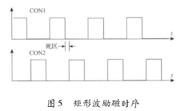 該電路主要由勵(lì)磁時(shí)序發(fā)生單元、三態(tài)緩沖器及隔離光耦組成。勵(lì)磁時(shí)序由dn65污水流量計(jì)系統(tǒng)的控制核心產(chǎn)生。采用DSP的EPWM外設(shè)模塊,通過設(shè)定其內(nèi)部定時(shí)器的工作模式發(fā)出所要求的勵(lì)磁頻率的勵(lì)磁時(shí)序PWM信號(hào)CT_1和CT_2。由于勵(lì)磁控制系統(tǒng)中的勵(lì)磁工作電源的電壓要比DSP的工作電源電壓高得多,為防止勵(lì)磁電路故障對系統(tǒng)控制核心產(chǎn)生致命影響,采用光耦將控制部分與勵(lì)磁部分進(jìn)行隔離。另外,由于DSP引腳的驅(qū)動(dòng)能力有限,所以在DSP與隔離光耦之間加入三態(tài)緩沖器以驅(qū)動(dòng)隔離光耦的輸入級(jí)。并且,DSP能夠通過GPIO口控制三態(tài)緩沖器上的使能引腳來使能和禁止勵(lì)磁,以在檢測到電路故障時(shí)迅速關(guān)斷H橋所有橋臂。該勵(lì)磁時(shí)序產(chǎn)生電路通過軟件編程可產(chǎn)生如圖5所示的單頻矩形波。在實(shí)際應(yīng)用中,由于組成H橋的達(dá)林頓三極管與MOS管導(dǎo)通與關(guān)斷的時(shí)間不一致,易在勵(lì)磁方向切換瞬間,產(chǎn)生上下橋臂同時(shí)導(dǎo)通的現(xiàn)象,反映在勵(lì)磁電流波形上為一幅值很高的窄脈沖。該脈沖電流不僅容易引起遲滯比較電路的誤輸出,從而導(dǎo)致高低壓切換電路與電流旁路電路的誤動(dòng)作,而且對恒流控制電路產(chǎn)生沖擊,減小三端穩(wěn)壓芯片的使用壽命,同時(shí)還會(huì)產(chǎn)生EMC電磁干擾,給測量精度帶來影響。所以實(shí)際應(yīng)用時(shí),如圖5所示對方波勵(lì)磁時(shí)序添加死區(qū),可以明顯減小上述現(xiàn)象。