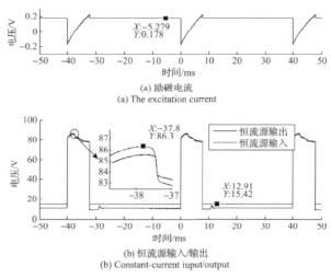 由圖7曲線結(jié)合圖2可知,在勵(lì)磁方向切換后,檢流電路檢測到的圖7(a)中的勵(lì)磁電流瞬間為負(fù),此時(shí)勵(lì)磁線圈處于電能泄放狀態(tài)并向能量反饋電路中的儲(chǔ)能電容充電。由于儲(chǔ)能電容充電,高、低壓切換電路的輸出電壓從80V逐漸升高;待勵(lì)磁線圈能量泄放完即勵(lì)磁電流為零時(shí),儲(chǔ)能電容兩端電壓達(dá)到*高86V并開始放電,勵(lì)磁電流開始上升;儲(chǔ)能電容電壓降低至80V時(shí),高低壓切換電路趨于80V的穩(wěn)定輸出狀態(tài),此時(shí)勵(lì)磁電流繼續(xù)上升;待勵(lì)磁電流上升至設(shè)定的超調(diào)量205 mA后,遲滯比較電路控制高低壓切換電路切換至17V低壓源作為勵(lì)磁工作電源,恒流電路在17V低壓源輸入下進(jìn)行恒流控制輸出。