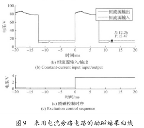 實(shí)驗(yàn)結(jié)果表明,高壓源向低壓源切換后,三端穩(wěn)壓器的工作特性致使的電流波動(dòng)和低壓源供電情況下的恒流控制,會(huì)大幅延長勵(lì)磁電流的穩(wěn)態(tài)響應(yīng)時(shí)間。圖8所示勵(lì)磁電流約在17ms左右進(jìn)入穩(wěn)態(tài),圖9所示勵(lì)磁電流的穩(wěn)態(tài)響應(yīng)時(shí)間約為12ms。這表明,在采用三端穩(wěn)壓器搭建恒流控制電路的情況下,電流旁路電路能有效克服三端穩(wěn)壓器工作特性的影響,并能方便的實(shí)現(xiàn)電流超調(diào),加快勵(lì)磁電流的響應(yīng)速度。