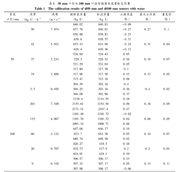 為了評測系統(tǒng)的實(shí)際應(yīng)用效果,進(jìn)行了水流量標(biāo)定實(shí)驗(yàn)。分別針對50mm口徑與100mm口徑的傳感器進(jìn)行標(biāo)定。系統(tǒng)勵(lì)磁方式采用方波勵(lì)磁,勵(lì)磁頻率為12.5Hz,管道*大流速為7m/s左右,*小流速為0.3 m/s左右,標(biāo)定結(jié)果如表1所示。