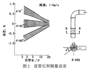 2000年上海原水公司擬在已建成的某泵站加裝DN2200稀硝酸流量計,但彎管下游安裝位置的前直管長度明顯不符合規(guī)定中5D~10D(D為管徑,下同)的要求,此時,影響測量誤差有多大呢?