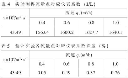 為證明該高粘度變流速自適應(yīng)算法及公式的有效性,重新選取四個(gè)流量點(diǎn):0.4m3/h、0.6m3/h、0.8m3/h、1.0m3/h對(duì)該公式以及算法進(jìn)行精度驗(yàn)證,得到表4數(shù)據(jù),表5為各對(duì)應(yīng)流量點(diǎn)的擬合后儀表系數(shù)的誤差。