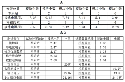 接地網(wǎng)的安裝與連接:接地網(wǎng)是整個加油站柴油流量計防雷試驗比較關(guān)鍵的一個內(nèi)容,能不能準(zhǔn)確的論證試驗的有效性,必須保證接地網(wǎng)達(dá)到標(biāo)準(zhǔn)的接地電阻,通過對實地地電阻率的測試,初步選擇6個接地模塊埋設(shè)并配用降阻劑使用,邊安裝邊測試直到達(dá)到標(biāo)準(zhǔn)值后才引入等電位箱。在軍樂站和松花閥室安裝模塊并測試數(shù)據(jù)見表1。