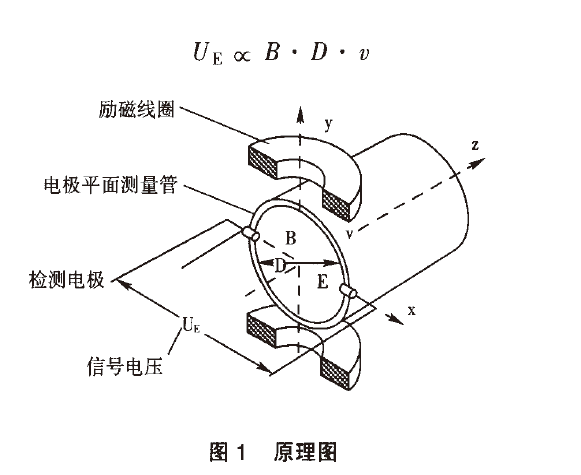產(chǎn)生與流量成比例的感應電勢,流體中產(chǎn)生的感應電動勢被位于管子徑向兩端的一對電極拾取,該信號電壓uE與磁場強度B、電極間距離D和平均流速穢成正比。磁場強度B和電極距離D是常數(shù),所以信號電壓與平均流速口成正比。計算公式如下: