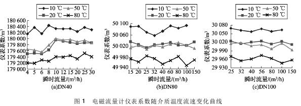 (1) 隨著介質(zhì)溫度的升高,環(huán)保污水專用流量計的儀表系數(shù)均呈逐漸降低的趨勢。其中20℃和50℃的儀表系數(shù)基本相同,10℃和80℃的儀表系數(shù)與20℃時偏離較大。