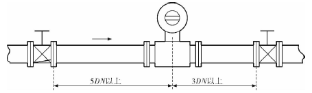 管道熱水流量計的安裝質(zhì)量對其測量結(jié)果的影響較大,因此在安裝時需要注意幾個問題。*先,管道熱水流量計直管段的選擇在配管時一定要按照要求進(jìn)行選擇,一般選擇流量計通徑與工藝管道通徑相同,即可滿足工程需要,而且安裝方便、壓力損失小,流量計直管段上游側(cè)的長度不少于5倍工藝管道直徑,下游側(cè)的長度不少于3倍工藝管道直徑(圖2)。但在流速太慢而又要求精度較高或需要變徑的應(yīng)用場合,可選擇通徑小于工藝管道通徑的流量計,以提高測量精度,此時流量計上、下游必須加裝異徑管,且進(jìn)口異徑管上游側(cè)應(yīng)有長于10倍工藝管道直徑的直管段,下游側(cè)應(yīng)有長于5倍工藝管道直徑的直管段(圖3)。
