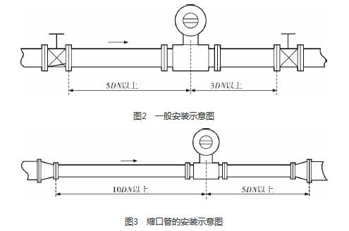 硝酸管道流量計(jì)的安裝質(zhì)量對(duì)其測(cè)量結(jié)果的影響較大,因此在安裝時(shí)需要注意幾個(gè)問題。*先,硝酸管道流量計(jì)直管段的選擇在配管時(shí)一定要按照要求進(jìn)行選擇,一般選擇流量計(jì)通徑與工藝管道通徑相同,即可滿足工程需要,而且安裝方便、壓力損失小,流量計(jì)直管段上游側(cè)的長(zhǎng)度不少于5倍工藝管道直徑,下游側(cè)的長(zhǎng)度不少于3倍工藝管道直徑(圖2)。但在流速太慢而又要求精度較高或需要變徑的應(yīng)用場(chǎng)合,可選擇通徑小于工藝管道通徑的流量計(jì),以提高測(cè)量精度,此時(shí)流量計(jì)上、下游必須加裝異徑管,且進(jìn)口異徑管上游側(cè)應(yīng)有長(zhǎng)于10倍工藝管道直徑的直管段,下游側(cè)應(yīng)有長(zhǎng)于5倍工藝管道直徑的直管段(圖3)。