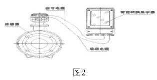測氨水流量計是由流量傳感器和轉(zhuǎn)換器(也叫顯示器)兩大部分組成。測量管上下裝有激磁線圈,通激磁電流后產(chǎn)生磁場穿過測量管,一對電極裝在測量管內(nèi)壁與液體相接觸,引出感應(yīng)電勢,送到轉(zhuǎn)換器。激磁電流則由轉(zhuǎn)換器提供。如圖2所示: