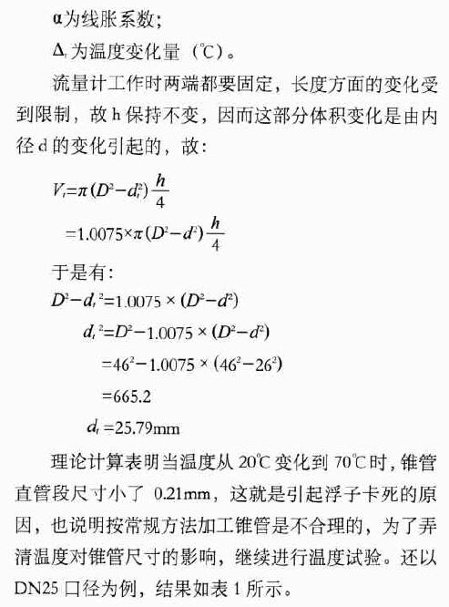 為了保持聚四氟乙烯零件尺寸的穩(wěn)定性,規(guī)定其溫度應(yīng)用范圍是70℃以下。在試制的初始階段,用常規(guī)加工方法,即按圖紙尺寸進(jìn)行錐管和浮子的加工,可以發(fā)現(xiàn),在常溫下工作正常的浮子在高溫試驗中出現(xiàn)了卡死現(xiàn)象,反復(fù)的試驗都得到同樣的結(jié)果。實際測量表明:浮子尺寸變化不大,因此推斷是由于錐管尺寸的變化引起卡死現(xiàn)象。通過理論計算,得出結(jié)論,以利改進(jìn)。