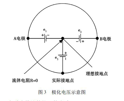 在被測(cè)液體與電極和接液部件接觸過程中,電解質(zhì)中的正負(fù)離子會(huì)分別作定向運(yùn)動(dòng),這會(huì)使被測(cè)液體在電極和接液部件之間形成電位差,通常將這種現(xiàn)象稱為極化現(xiàn)象。如圖3 所示,理論上來說,兩電極A 和B 對(duì)接液部件的電位e1、e2大小相等、方向相反,此時(shí)兩電極的電位差等于零。但是,若兩電極的材質(zhì)或表面狀態(tài)存在差異,此時(shí)A、B 電極之間的電位差就不為零,這就形成了極化電壓,極化電壓與共模狀態(tài)的電壓e3一起疊加在流量信號(hào)中,被輸入轉(zhuǎn)換器的差動(dòng)放大器。當(dāng)極化電壓過大,則會(huì)對(duì)差動(dòng)放大器的輸入端造成較大影響,導(dǎo)致信號(hào)無法放大或流量信號(hào)的輸出波動(dòng)過大,從而降低了鹽水流量計(jì)的測(cè)量精度。