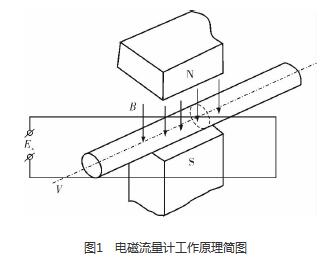 污水處理廠進(jìn)水流量計(jì)是利用法拉*電磁感應(yīng)定律設(shè)計(jì)的流量測(cè)量?jī)x表,用于測(cè)量導(dǎo)電液體的體積流量。根據(jù)法拉*電磁感應(yīng)定律,當(dāng)導(dǎo)體切割磁力線運(yùn)動(dòng)時(shí),導(dǎo)體內(nèi)將產(chǎn)生感應(yīng)電動(dòng)勢(shì)Ex(圖1),方向根據(jù)右手定則確定,感應(yīng)電動(dòng)勢(shì)Ex的大小與磁場(chǎng)的磁感應(yīng)強(qiáng)度B、傳感器管道的內(nèi)徑D和流過導(dǎo)電液體的流速V成正比,B、D、V三者相互垂直,即Ex=BDV。