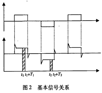 冷凍水計(jì)量表一般都采用工頻交流電源供電,其電源電壓的幅值和頻率的變化都會(huì)給冷凍水計(jì)量表帶來電源性干擾噪聲。對(duì)電源電壓的幅值變化,因采用多級(jí)集成穩(wěn)壓,一般而言電源電壓的幅值變化對(duì)電磁流量的測量精度影響不大。當(dāng)電源電壓的頻率波動(dòng)時(shí),雖然其波動(dòng)范圍有限,但對(duì)冷凍水計(jì)量表測量精度影響較大。為了解決工頻干擾問題,實(shí)現(xiàn)對(duì)流體流速感應(yīng)電勢e柚信號(hào)的準(zhǔn)確測量,需利用以下基本關(guān)系:①勵(lì)磁周期為工頻周期的整數(shù)倍,即勵(lì)磁頻率為50/nHz(n為偶數(shù));②正負(fù)勵(lì)磁下的同相位采樣。圖2是對(duì)應(yīng)低頻矩形波勵(lì)磁形式下的典型電勢信號(hào)形式,按上述關(guān)系在一個(gè)勵(lì)磁周期下,若假設(shè)t。和t:點(diǎn)為工頻干擾的等效干擾點(diǎn),且采樣寬度T=T1=T2,則e –ab的基本算式為:,