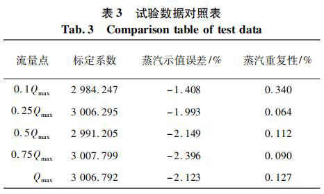 測(cè)試對(duì)象為同一臺(tái)表,DN80 口徑,帶有在空氣標(biāo)定裝置上的 5 點(diǎn)標(biāo)定系數(shù)。將管道介質(zhì)設(shè)定為過(guò)熱蒸汽,并預(yù)設(shè)溫度為 160 ℃ 和壓力 0. 4 MPa,以便儀表計(jì)算過(guò)熱蒸汽的密度。試驗(yàn)數(shù)據(jù)對(duì)照如表 3 所示。