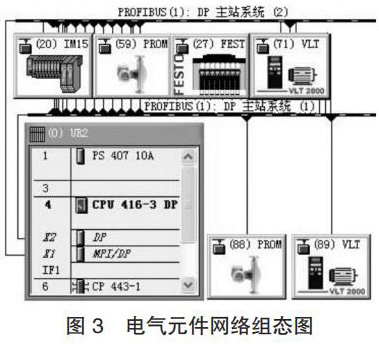 (1)電氣元件組態(tài)。把增加的質(zhì)量流量計和變頻器添加到香料廚房 S7-400 PLC 控制系統(tǒng)的 PROFIBUS 網(wǎng)中,其網(wǎng)絡組態(tài)如圖 3 所示,圖中 PROFIBUS-DP 地址 88 和 89 為硬件系統(tǒng)增加的質(zhì)量流量計和變頻器。
