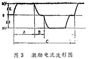 (1)激勵(lì)電流的波形檢查。在激勵(lì)電流檢查端EX+和EX一之間連接一個(gè)電阻(IΩ士0.1%),這個(gè)電阻與激勵(lì)線圈串聯(lián),示波器輸入端并聯(lián)在電阻上。若波形起伏很大時(shí),則不正常。波形正,負(fù)方向?qū)ΨQ,A一C測(cè)量周期值在規(guī)定的范圍內(nèi)則為正常,其波形如圖3所示。