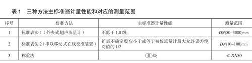 本規(guī)范包含三種校準(zhǔn)方法,分別為標(biāo)準(zhǔn)表法 1(外夾式超聲流量計(jì))、標(biāo)準(zhǔn)表法 2(串聯(lián)移動(dòng)式在線校準(zhǔn)裝置)和稱重法,編制組對(duì)每種方法進(jìn)行了大量的實(shí)驗(yàn),并積極與智能電磁流量計(jì)生產(chǎn)廠家及用戶溝通探討,積累了豐富的經(jīng)驗(yàn),獲得了大量的實(shí)驗(yàn)數(shù)據(jù),*終確定三種方法的主標(biāo)準(zhǔn)器計(jì)量性能和對(duì)應(yīng)的測(cè)量范圍,如表 1 所示。