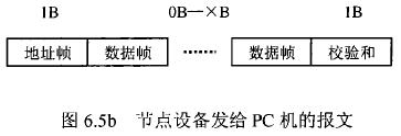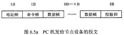 分體式電磁流量計(jì)等節(jié)點(diǎn)設(shè)備和C機(jī)通信的過程中,由地址幀、命令幀、數(shù)據(jù)幀、校驗(yàn)和可組成各種功能不同的報(bào)文。由于采用主從工作方式來實(shí)現(xiàn)通信,分體式電磁流量計(jì)等節(jié)點(diǎn)設(shè)備僅能接收并執(zhí)行PC機(jī)發(fā)送來的控制命令,而不能發(fā)送命令給PC機(jī)。因此,由PC機(jī)發(fā)往流量計(jì)等節(jié)點(diǎn)設(shè)備的報(bào)文一般包括一個地址幀,一個命令幀,若干個數(shù)據(jù)幀和一個校驗(yàn)和,其報(bào)文格式圖.6a5所示;而由流量計(jì)等節(jié)點(diǎn)設(shè)備發(fā)往PC機(jī)的報(bào)文一般包括一個地址幀,若干個數(shù)據(jù)幀和一個校驗(yàn)和,其報(bào)文格式如圖6.5b所示。
