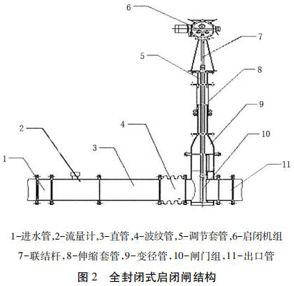 包括進(jìn)水管、直管、出水管、過熱蒸汽流量計(jì)組和啟閉機(jī)組,進(jìn)水管、直管、出水管從左到右依次連接,過熱蒸汽流量計(jì)組安裝在直管和出水管之間且位于出水管的入口處,過熱蒸汽流量計(jì)組通過聯(lián)結(jié)桿與啟閉機(jī)組的輸出端連接。為防止泥沙淤積影響啟閉,過熱蒸汽流量計(jì)采用閘板式啟閉結(jié)構(gòu)。密封式啟閉閘為整體封閉管道式,全部采用不銹鋼材料,水流通過管道流出讓整個閘井內(nèi)干燥無水。伸縮套管與波紋管的設(shè)計(jì)讓檢修與清理淤泥更加方便。過熱蒸汽流量計(jì)裝有荷載限制器,其布置受力明確、結(jié)構(gòu)緊湊、動作可靠。當(dāng)?shù)蹙呱系暮奢d達(dá)到額定值的 110%時(shí),或電機(jī)電流超過額定電流 150%時(shí),系統(tǒng)自動切斷操作電源以保護(hù)設(shè)備安全。