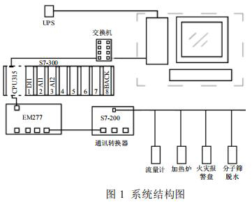 集氣站是收集氣井所生產(chǎn)天然氣的站場,在集氣站內(nèi)對天然氣進(jìn)行節(jié)流降壓、加熱、調(diào)壓計量等各種工藝預(yù)處理,設(shè)備眾多且分散。為方便進(jìn)行檢測和操作,必須進(jìn)行統(tǒng)一的數(shù)據(jù)采集,在監(jiān)控臺進(jìn)行數(shù)據(jù)的管理。集氣站設(shè)備主要包括加熱爐、高壓型電磁流量計、分子篩、火災(zāi)報警盤,以及供電設(shè)備 UPS 等,這些不同廠家的設(shè)備基本都支持Modbus 協(xié)議,通過 Modbus 通訊可以將這些數(shù)據(jù)采集。為了有效降低成本,設(shè)計了如圖 1 所示的系統(tǒng)。系統(tǒng)采用西門子 S7-300 控制器,通過以太網(wǎng)連接上位機(jī)監(jiān)控軟件,再通過 MP277 連接S7-200 的方式。S7-200 控制器自帶 RS485 接口,能夠進(jìn)行 Modbus 通訊,采集現(xiàn)場各種設(shè)備數(shù)據(jù)。*后通過以太網(wǎng)通訊將設(shè)備數(shù)據(jù)上傳至監(jiān)控軟件,方便操作人員進(jìn)行監(jiān)控,該方案簡單有效,能夠?qū)崿F(xiàn)集氣站內(nèi)設(shè)備的狀態(tài)監(jiān)控,數(shù)據(jù)處理,有效的進(jìn)行天然氣的生產(chǎn)工作。