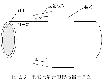 傳感器的主要作用是將通過管道的流量信號進行轉(zhuǎn)換,將其轉(zhuǎn)為電動勢。市面上常見的傳感器主要有下圖 2.4 中如測量管、鐵芯、勵磁線圈、襯里等結(jié)構(gòu)。