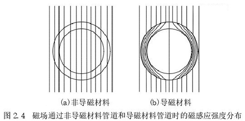 1.測量管:主要是傳感器的管道,該管道由高導電率非導磁材料制成,可保證流體在通過時能夠表現(xiàn)出自身的電磁效應(yīng),在該管道內(nèi)中安裝了內(nèi)襯。使用非導磁材料的原因是保證勵磁線圈中所產(chǎn)生的磁場不會順著管道流走,確保測量管道內(nèi)部產(chǎn)生明顯的磁感應(yīng)線,下圖 2.4 中展示了利用非導磁材料和導磁材料管道中所產(chǎn)生磁感應(yīng)線的情況。
