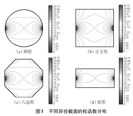 為考察不同異徑截面權(quán)函數(shù)分布的均勻性,使用上述方法對(duì)圓形、正方形、八邊形和矩形異徑截面的權(quán)函數(shù)分布進(jìn)行定性分析。為了便于對(duì)比,設(shè)置管道口徑為DN100,異徑部分截面積為3200mm2。所以,圓形異徑面半徑為32mm,正方形異徑面邊長(zhǎng)為56.6mm,八邊形異徑面邊長(zhǎng)為25.8mm,矩形異徑面長(zhǎng)寬為80×40mm。仿真結(jié)果如圖1所示,為了便于對(duì)比,權(quán)函數(shù)等勢(shì)線(xiàn)大小從0開(kāi)始,以0.25為步長(zhǎng)遞增到30。由圖1(a)~圖1(d)可知,矩形異徑截面的權(quán)函數(shù)等勢(shì)線(xiàn)間距*大,即權(quán)函數(shù)變化梯度*小,權(quán)函數(shù)分布*均勻。