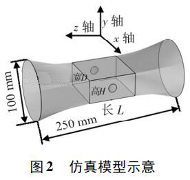 使用 Pro /E 軟件建立三維幾何模型,導(dǎo)入 COMSOL 軟件進(jìn)行有限元求解。仿真模型如圖 2 所示,電極連線(xiàn)為x 軸,連線(xiàn)中點(diǎn)為坐標(biāo)原點(diǎn),流體運(yùn)動(dòng)方向?yàn)?z 軸,傳感器管道口徑為 DN100,總長(zhǎng)250 mm。異徑管部分初始結(jié)構(gòu)尺寸 L = 80 mm,D = 80 mm,H = 40 mm,圓形電極半徑為17 mm,伸出絕緣襯里的*大距離為 1. 5 mm。