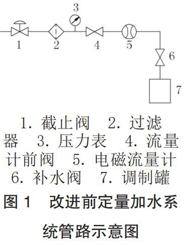 工廠的香料廚房系統(tǒng)為國內煙機公司 2004 年設計制造,其定量加水系統(tǒng)主要由水源、白酒流量計、加水管路元件和控制程序這四部分組成,改進前管路示意圖如圖 1 所示。