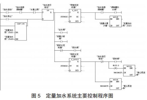定量加水系統(tǒng)的工作過程為:當設定好加水量后,啟動系統(tǒng),多級離心泵 10、回流閥 4、出水閥 9 和流量計前閥 12開啟對管路進行預填充;延時 30s 預填充完成后,回流閥 4關閉,調制罐補水閥 14 開啟,同時質量流量計 13 開始計量;當質量流量計的累積量與設定加水量一致時,出水閥 9 和調制罐補水閥 14 關閉;調制罐定量加水完成后,開啟回收閥17 和回流閥 4 以及同未關閉流量計前閥 12 一起,利用壓縮空氣對管道中水實現(xiàn)回收;延時 30s 水回收完成后,關閉多級離心泵、球閥 4、12 和 17,定量加水過程完成。定量加水系統(tǒng)主要控制程序如圖 5 所示。