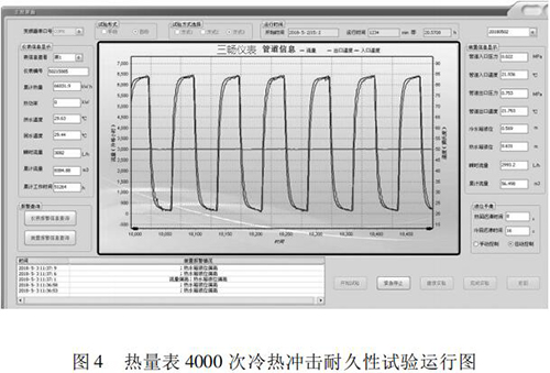 本文研究的 4000 次冷熱沖擊試驗的實現(xiàn)具有以下特點: (1)基于“工控機 +水泵 + 煤油流量計”的閉環(huán)控制系統(tǒng),實現(xiàn)了流量自動反饋調節(jié),滿足試驗要求; (2)通過四個開關閥的時序切換,自動控制試驗溫度,很好的完成了 4000 次溫度沖擊試驗; (3)通過“工控機 + 數(shù)據(jù)數(shù)據(jù)采集卡”的數(shù)據(jù)采集系統(tǒng),實時監(jiān)控試驗過程中的流量、溫度、壓力等相關參數(shù),實現(xiàn)試驗方式的自動控制,并能對試驗數(shù)據(jù)進行分析與評定。 (4)試驗的全過程為智能自動化,可無人員留守看護。試驗結果可直接反映出熱量表在長時間運行后的可靠性。為我國熱量表耐久性試驗研究提供檢測手段,為促進產品質量提升做好技術保障。