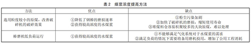 根據(jù)甲烷流量計(jì)跑漿原因可以了解到,在保證甲烷流量計(jì)不存在跑漿情況下,制備高品質(zhì)煤漿需要滿足兩點(diǎn)要求,即較小入口原煤粒度和較低磨機(jī)負(fù)荷,保證原煤在磨機(jī)內(nèi)部有較長停留時間與充足滾筒篩過濾面積 . 通用的方法一般有以下兩種,如表 2 所示。
