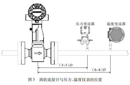 氫氣流量計的口徑如果與工藝管道相同,不能滿足流量儀表要求時,或者在此流速下測量準(zhǔn)確度不能保證時,需要縮小儀表口徑,從而提高管內(nèi)流速,保證測量精度。上下游必須有足夠的直管段,若傳感器安裝點的上游在同一平面上有 2 個 90°彎頭時,上游直管段≥25D,下游直管段≥5D。根據(jù)測量的需要,需在氫氣流量計附近測量壓力和溫度時,測壓點應(yīng)在傳感器下游的( 3 ~ 5) D 處,測溫點應(yīng)在傳感器下游的( 6 ~ 8) D 處,如圖 3 所示。