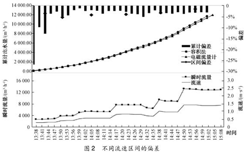 圖 2 的結果顯示,容積法校驗電磁流量計累計偏差開始階段不穩(wěn)定,后期趨于穩(wěn)定,在 -3. 0%附近。這是測量中不可避免存在某幾個時刻(特別出廠水流量改變時)某些測量點液位波動較大,導致記錄數值與真實情況存有較大差異,一開始累計出水總量較少,偏差會相對放大,在后期累計水量大,這一原因導致的偏差減少,偏差值也趨于穩(wěn)定。