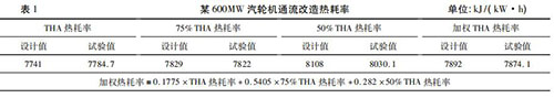 隨著火電機(jī)組利用小時(shí)數(shù)降低,發(fā)電企業(yè)一般都會根據(jù)不同負(fù)荷工況下的實(shí)際運(yùn)行小時(shí)數(shù),確定機(jī)組熱耗率考核權(quán)重,形成*終的加權(quán)熱耗率考核值。考核加權(quán)熱耗率對設(shè)備廠家末級葉片選型、高壓調(diào)門與高壓缸匹配性提出了更高的要求,在當(dāng)前負(fù)荷率偏低的情況下增強(qiáng)了發(fā)電企業(yè)的競爭力。然而,僅僅對加權(quán)熱耗率進(jìn)行考核是不夠的,設(shè)備廠家為了增強(qiáng)自身的競爭力,往往會把全部重點(diǎn)放在如何降低占比大的低負(fù)荷熱耗率上而犧牲高負(fù)荷的熱耗率,這無疑削弱了發(fā)電企業(yè)的適應(yīng)性。某廠一臺 600MW 汽輪機(jī)通流改造時(shí)僅對加權(quán)熱耗率進(jìn)行考核,THA 熱耗率要高出設(shè)計(jì)值43. 7 kJ/( kW·h) ,詳見表 1。通流改造時(shí)既要對加權(quán)熱耗率進(jìn)行考核,也要對 THA工況時(shí)熱耗率進(jìn)行考核。