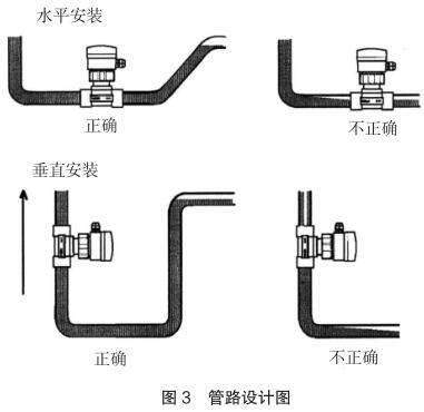 現(xiàn)場(chǎng)安裝時(shí)應(yīng)注意遠(yuǎn)離可能對(duì)其產(chǎn)生干擾的大型設(shè)備,防止長(zhǎng)期的熱輻射和其他如磁場(chǎng)直射等環(huán)境影響。為確保高測(cè)量精度和較好的零點(diǎn)穩(wěn)定性,進(jìn)行校正前,高壓電磁流量計(jì)應(yīng)裝入工藝介質(zhì)中至少 24 小時(shí)電極鈍化。安裝的管路設(shè)計(jì)應(yīng)確保管道始終充滿流體,防止測(cè)量誤差,管路設(shè)計(jì)圖見圖 3。