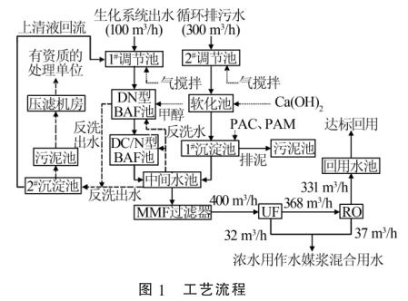 2種廢水在中間水池混勻后,通過(guò)泵提升進(jìn)入保安過(guò)濾器,進(jìn)一步去除細(xì)小的懸浮物后經(jīng)過(guò)增壓泵進(jìn)入超濾膜(UF)處理系統(tǒng)和反滲透(RO)系統(tǒng),然后通過(guò)液體電磁流量計(jì)進(jìn)行計(jì)量。反滲透出水直接進(jìn)入回用水池達(dá)標(biāo)回用,超濾濃水以及反滲透濃水用作水煤漿混合用水。污泥池中的污泥通過(guò)泵打入帶式機(jī)壓濾處理,濾液自流進(jìn)入1#調(diào)節(jié)池。工藝流程見(jiàn)圖1。