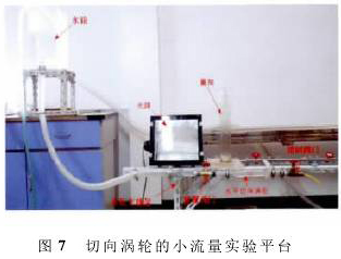為了驗(yàn)證仿真的準(zhǔn)確性,通過(guò)室內(nèi)實(shí)驗(yàn)對(duì)其驗(yàn)證。切向渦輪采用可視化研究平臺(tái),整個(gè)渦輪的結(jié)構(gòu)都采用亞克力板雕刻組裝而成。如圖7所示,水箱主要提供穩(wěn)定水壓,水平切向渦輪做成開(kāi)口系統(tǒng)并放置在實(shí)驗(yàn)支撐架上,前置閥門(mén)可控制水流,在需要更換切向渦輪的零件時(shí)可關(guān)閉,控制閥門(mén)主要是控制流經(jīng)切向渦輪的流量,流量測(cè)量仍采用傳統(tǒng)可靠的容積時(shí)間法。實(shí)驗(yàn)時(shí)以染色劑作為示蹤劑,以觀察流場(chǎng)的分布情況。