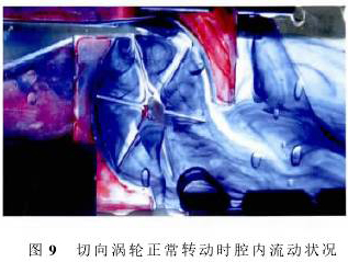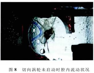 圖9記錄的是切向渦輪正常轉(zhuǎn)動(dòng)時(shí)的流場(chǎng),圖9中水從左向右流動(dòng),實(shí)驗(yàn)時(shí)水速較快(1m3/d),渦輪葉片順時(shí)針轉(zhuǎn)動(dòng)。水速變大后,擾動(dòng)變大,不再是無(wú)旋繞角流動(dòng),腔體1中流體形成一個(gè)運(yùn)動(dòng)的旋渦,導(dǎo)致腔內(nèi)壓強(qiáng)分布不再對(duì)稱,產(chǎn)生壓差,致使渦輪葉片轉(zhuǎn)動(dòng),旋渦在隨葉片運(yùn)動(dòng)到腔體2中時(shí)逐漸耗散消失。數(shù)值仿真的計(jì)算結(jié)果與物理實(shí)驗(yàn)的結(jié)果基本一致。