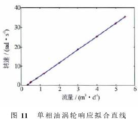 采用同樣的方法,對(duì)單相油條件下渦輪響應(yīng)規(guī)律進(jìn)行研究(見(jiàn)圖11),測(cè)得單相油的啟動(dòng)排量為0.08m3/d。對(duì)單相油的實(shí)驗(yàn)結(jié)果進(jìn)行擬合,可得單相油的響應(yīng)曲線為ω=6.73Q-6.72。與水對(duì)比而言,油的擬合曲線斜率更大,即隨著流量增加轉(zhuǎn)速增加得略快。