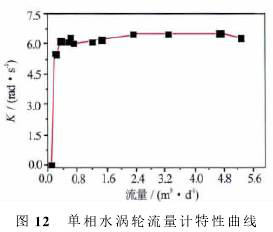 可以看出,渦輪啟動(dòng)后*先進(jìn)入一個(gè)非線性段,在非線性相應(yīng)段,K值隨著流量增加而增大;當(dāng)流量比較大(單相水超過(guò)0.5m3/d,單相油超過(guò)1m3/d)時(shí),渦輪進(jìn)入線性段,在線性響應(yīng)段,K值達(dá)到峰值,有相對(duì)較小的波動(dòng)。