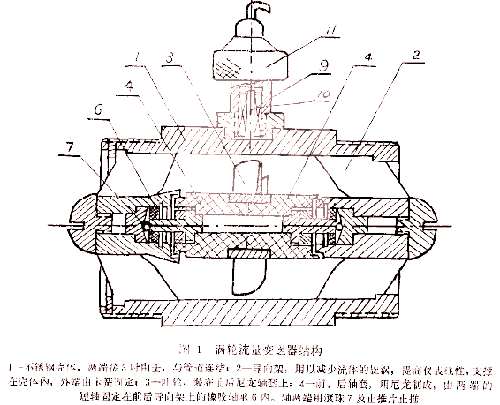 在固井過程使用重油流量計, 主要解決渦輪變送器的耐高壓、耐震以及高速下的耐磨蝕問題。在這方面, 我們采用了耐磨橡膠軸承 , 尼龍軸套, 單滾珠止推等措施, 基本上可以滿足施工要求。結構主要由不銹鋼殼體、導向架、葉輪和前后軸套組成, 見上圖1。