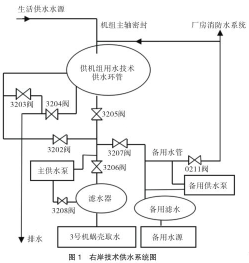 大化電廠技術(shù)供水包括右岸和左岸供水,本文以右岸 3 號機(jī)技術(shù)供水系統(tǒng)增設(shè)帶現(xiàn)場顯示航空煤油流量計技術(shù)改造方案為例進(jìn)行分析說明。右岸技術(shù)供水系統(tǒng)(見圖 1)由各機(jī)組單元蝸殼取水主水源、濾水器、主供水泵、正反向切換閥(3202 閥與 3204 閥開為反向取水,3203 閥與 3205閥開為正向取水,運(yùn)行時只開其中一種)、備用水源、備用濾水器、備用供水泵和備用總水管構(gòu)成一個整體,并通過 0211 閥與廠房消防水系統(tǒng)相連接,可通過主水源自流供水、主水源水泵增壓供水、備用水源自流供水、備用水源水泵增壓供水等不同供水方式向機(jī)組推力軸承冷卻器和發(fā)導(dǎo)軸承冷卻器、水導(dǎo)軸承冷卻器、發(fā)電機(jī)空氣冷卻器提供冷卻水源。機(jī)組技術(shù)供水正常運(yùn)行采用單元蝸殼取水的供水方式運(yùn)行,以備用水源供水為輔。機(jī)組主軸密封用水分別取自生活供水水源和技術(shù)供水備用總管水源,向機(jī)組大軸提供可調(diào)水壓端面密封水源。在現(xiàn)場配置一個技術(shù)供水現(xiàn)地單元柜,實現(xiàn)對機(jī)組技術(shù)供水系統(tǒng)設(shè)備自動控制、故障保護(hù)及報警。柜內(nèi)配置可編程 PLC 控制系統(tǒng),電控柜對主供增壓泵、3202 至 3208 電動碟閥進(jìn)行流程控制。