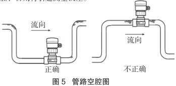 測量流向取決于航空煤油流量計的安裝方位,將航空煤油流量計在接頭上旋轉(zhuǎn) 180 度即可反向。正流向時,航空煤油流量計的突耳應(yīng)在上游方向。流量顯示總是正的,而累加器可以根據(jù)流向增加或者減少。安裝中確認(rèn)管路設(shè)計不允許在介質(zhì)中產(chǎn)生氣泡或空腔,否則將引起測量誤差(見圖 5)。