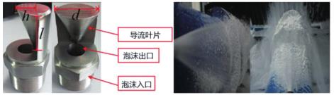 圖 1 為電弧風(fēng)扇噴嘴的結(jié)構(gòu)和噴霧,一種新型的噴嘴主要由一個(gè)過熱蒸汽渦街流量計(jì)入口、出口和導(dǎo)流葉片組成。出流口的圓柱形設(shè)計(jì)降低了湍流強(qiáng)度。導(dǎo)流葉片類似于流線型尾部,產(chǎn)生類似于弧形風(fēng)扇形狀的過熱蒸汽渦街流量計(jì)噴霧,其形狀類似于掘進(jìn)機(jī)的粉塵源。